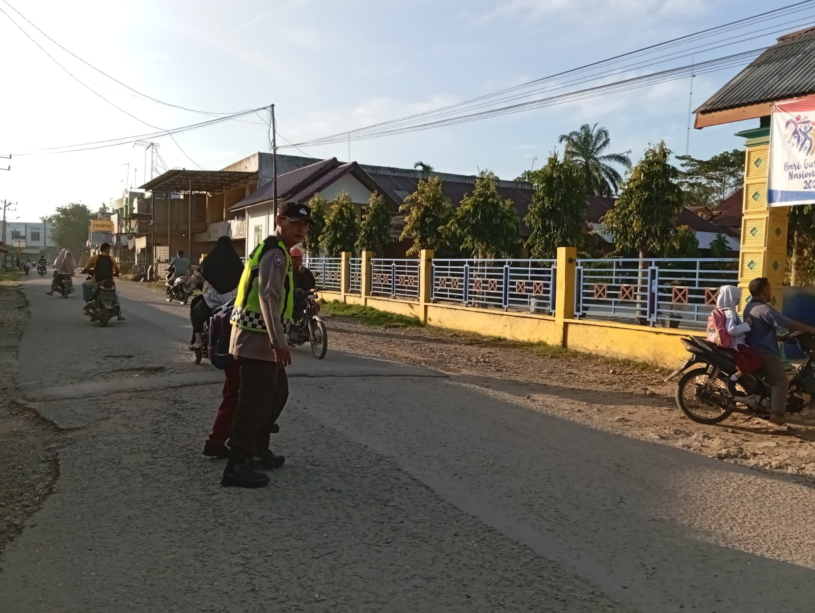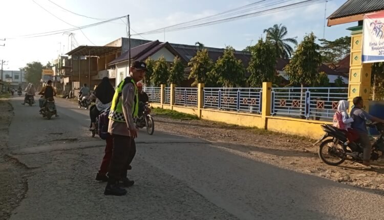 Antisipasi Kecelakaan, Personel Polsek Tamiang Hulu Lakukan Gatur Lalin di Jam Masukan Anak Sekolah