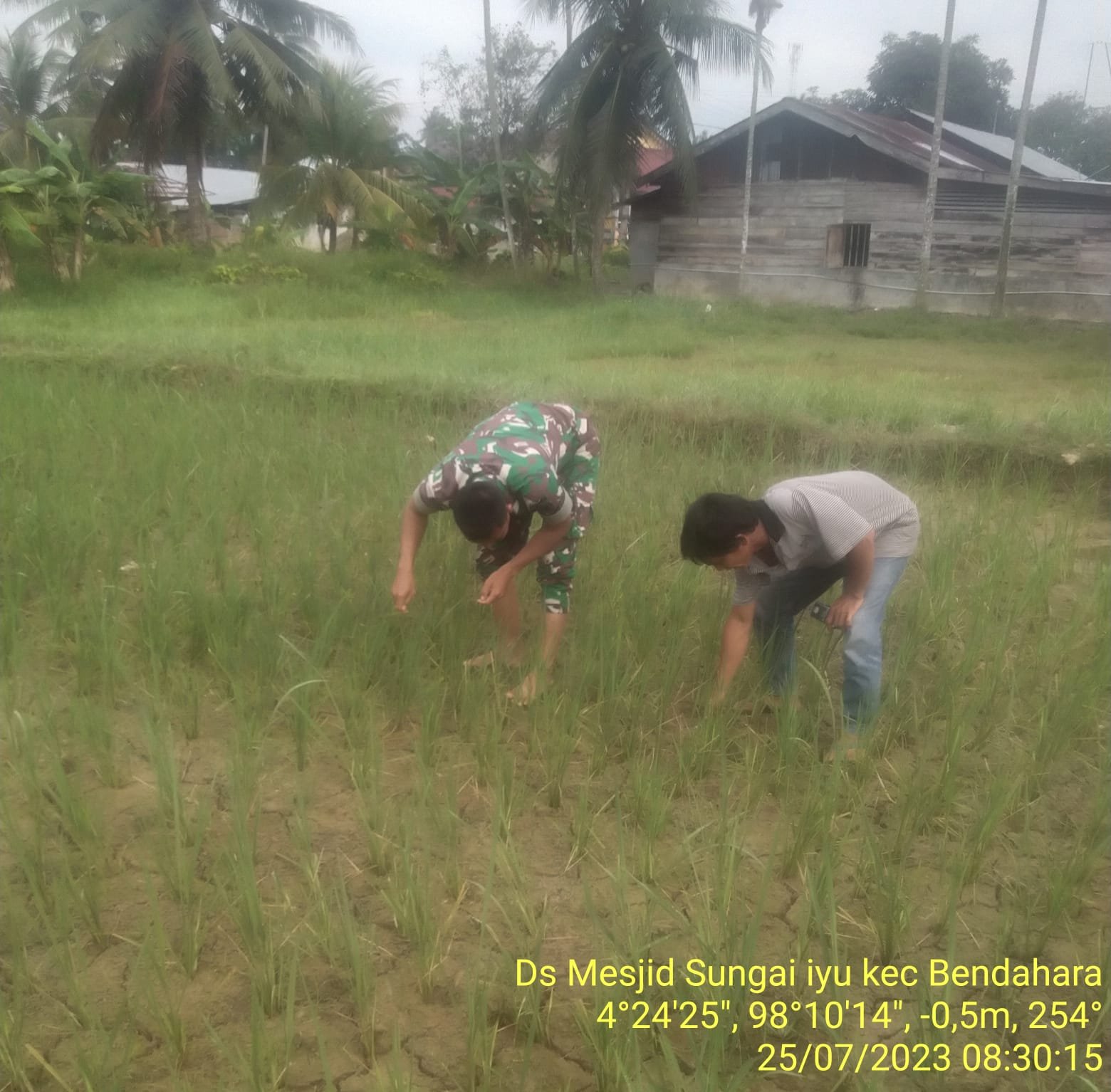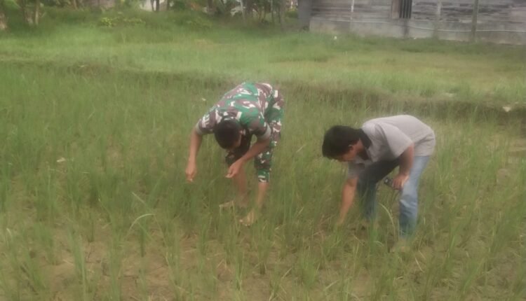 TODAYBERITA.COM- Aceh Tamiang | Dalam rangka menyukseskan swasembada pangan nasional, Babinsa Koramil 04/Bendahara Serda Dedi Syahputra melaksanakan kegiatan dan pendampingan membantu petani yang sedang membersihkan rumput-rumput yang mengganggu pertumbuhan padi di Desa Mesjid Sungai Iyu, Kecamatan Bendahara, Kabupaten Aceh Tamiang. Selasa (25/07/2023).