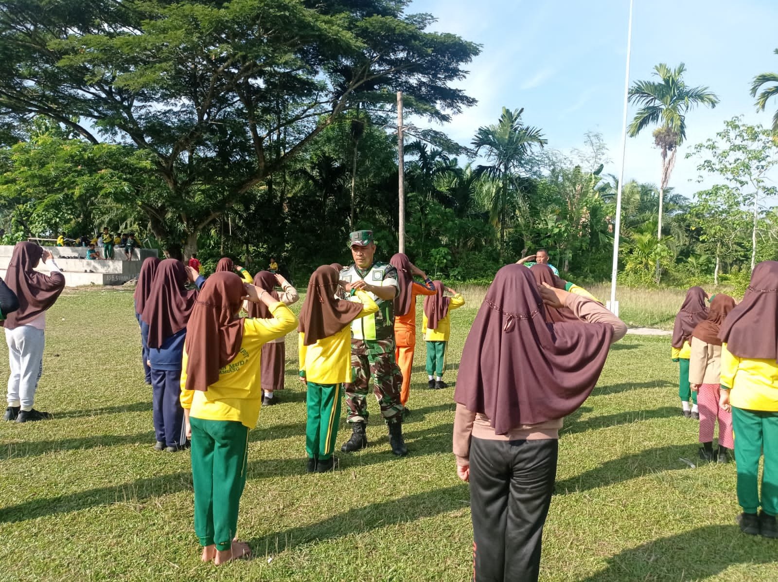 Terlihat di lapangan antusias para siswa dalam mengikuti latihan PBB yang diberikan oleh babinsa baik saat pemberian materi teori para siswa memperhatikan dengan seksama apa yang dijelaskan oleh babinsa dan juga saat melaksanakan praktek para siswa pun terlihat penuh semangat mengikuti gerakan demi gerakan yang dilatihkan.