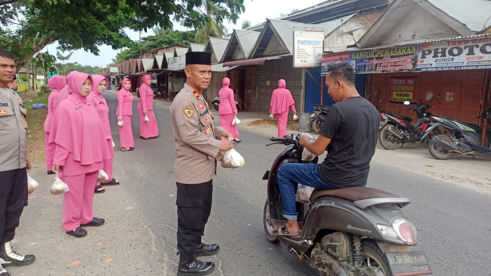 TODAYBERITA.COM -Aceh Tamiang |Polda Aceh, Kapolsek Rantau IPTU Agus Gani Harto, S.H bersama Bhayangkari Ranting Rantau dan Personel Polsek Rantau Membagikan Takjil Kepada pengguna jalan di depan Mapolsek Rantau. Selasa (26/03/2024).