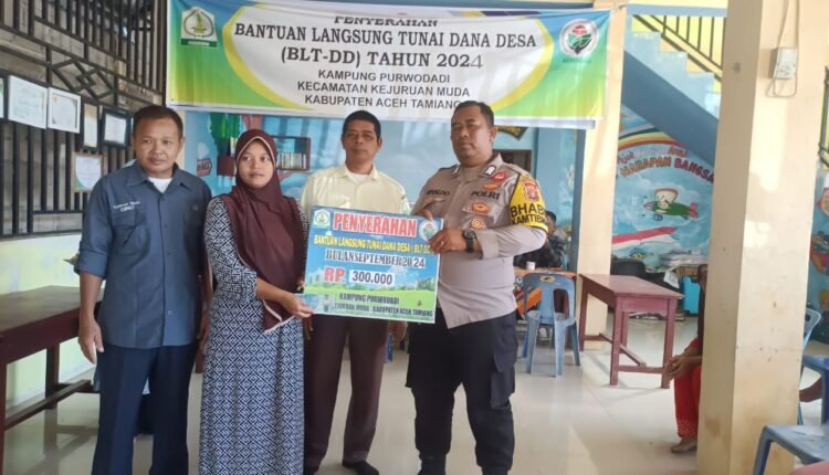 TODAYBERITA.COM | ACEH TAMIANG – Polda Aceh, Personel Bhabinkamtibmas Desa Purwodadi, Polsek Kejuruan Muda melaksanakan pengamanan dan Monitoring Penyaluran Bantuan Langsung Tunai (BLT) bersumber dari Dana Desa (DD) Tahun Anggaran 2024 di Kantor Datok Penghulu Desa Purwodadi Kecamatan Kejuruan Muda Kabupaten Aceh Tamiang. Kamis (5/08/2024).