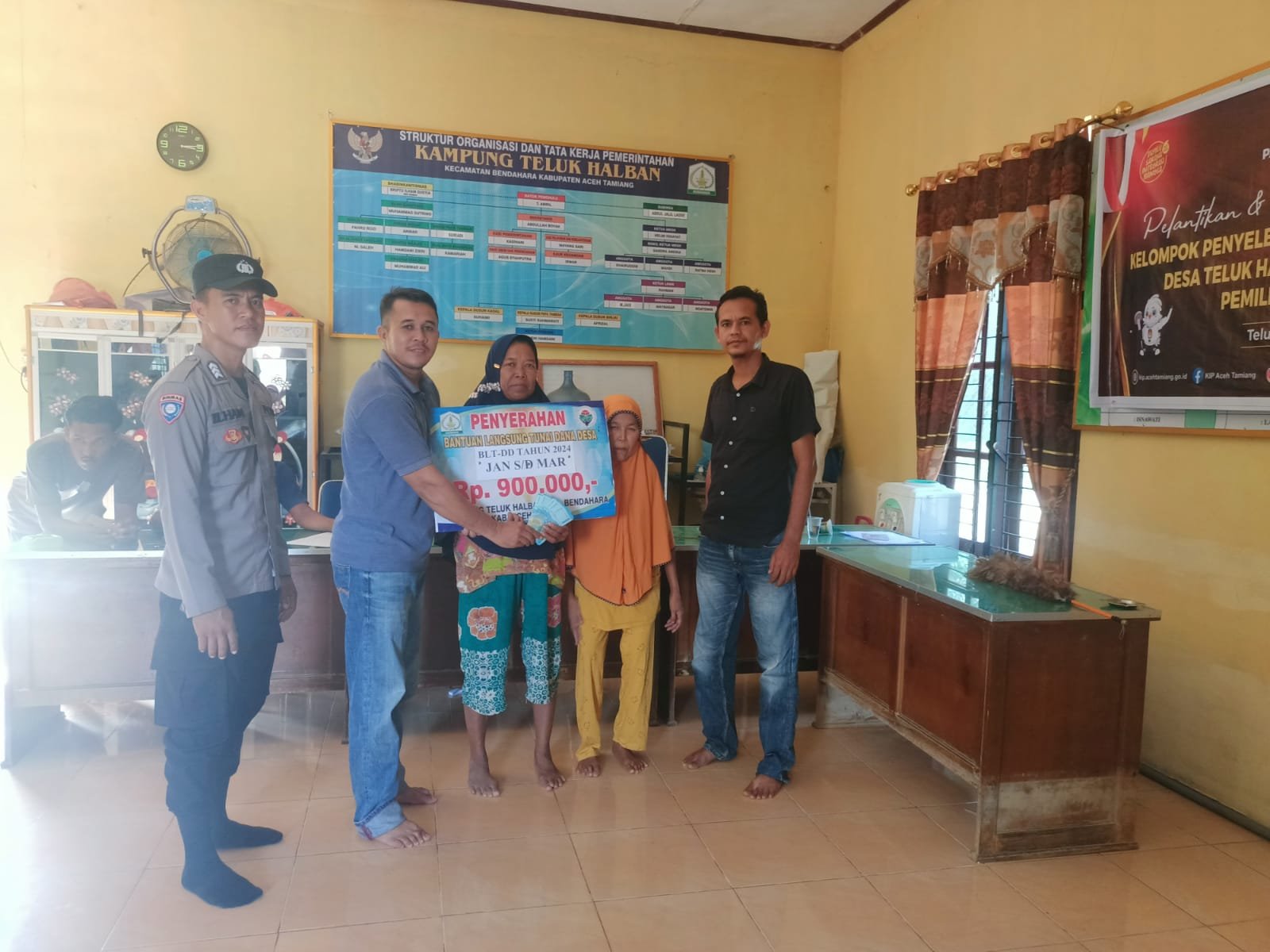 TODAYBERITA.COM | Aceh Tamiang Polda Aceh, Bhabinkamtibmas Desa Teluk Halaban Polsek Bendahara melaksanakan Monitoring Penyaluran Bantuan Langsung Tunai (BLT) bersumber dari Dana Desa (DD) Tahun Anggaran 2024 di Kantor Datok Penghulu Desa Teluk Halaban Kecamatan bendahara Kabupaten Aceh Tamiang. Jum’at (05/04/2024).