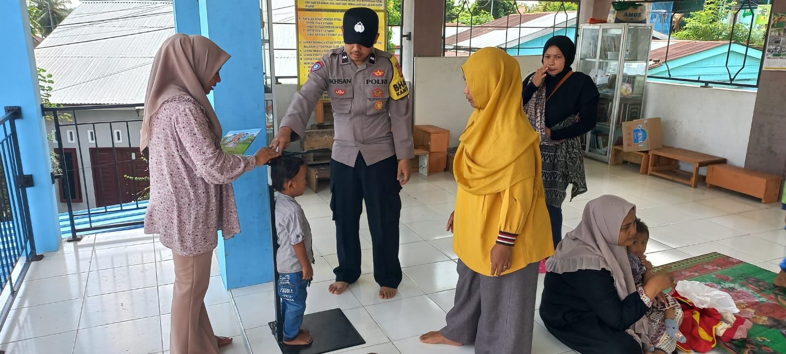 Bhabinkamtibmas Polsek Kuala Simpang Polres Aceh Tamiang Jajaran Polda Aceh Aipda Ikhsan Perdana melaksanakan kegiatan pendampingan Bidan Desa dan warga masyarakat yang memiliki Balita untuk melaksanakan Posyandu Balita.