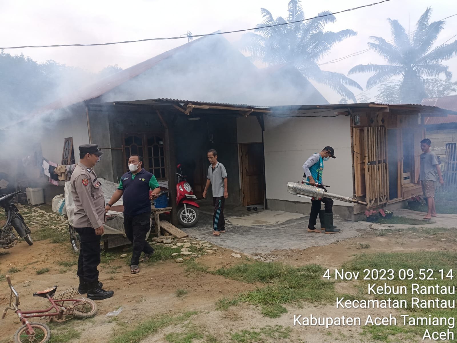 TODAYBERITA.COM| Aceh Tamiang – Sebagai upaya antisipasi penyebaran Deman Berdarah (DBD) di wilayah Kecamatan Rantau, Personil Bhabinkamtibmas Polsek Rantau bersama Pihak Puskesmas Rantai dan masyarakat melaksanakan Gotong Royong Penyemprotan (Fogging ) di Desa Kebun Rantau. Sabtu (04/11).