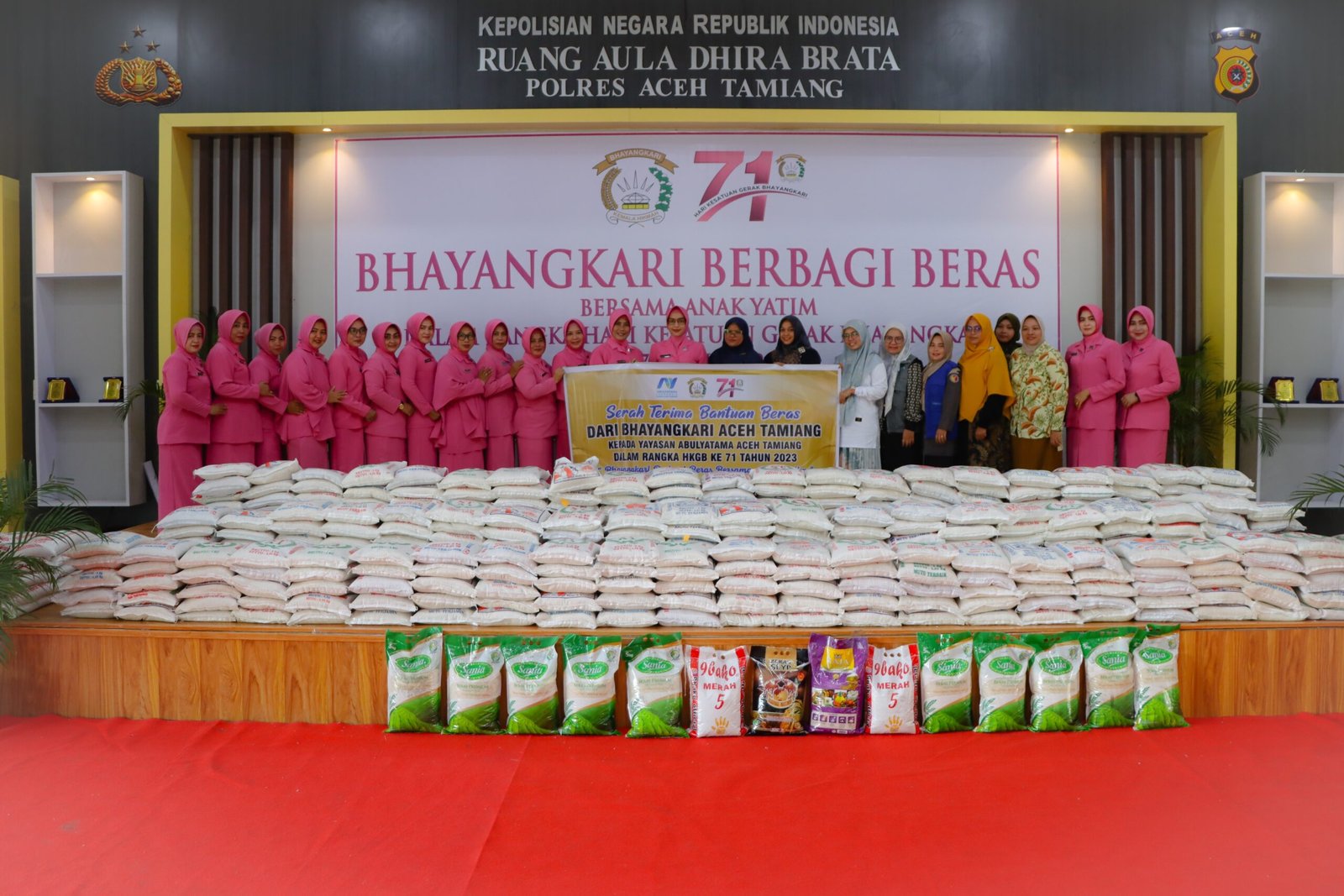 Adapun Bantuan yang diserahkan berupa 500 sak/goni beras 5 kg yang diserahkan langsung oleh Ketua Bhayangkari Cabang Aceh Tamiang Ny. Dewi Yanis kepada ketua yayasan Abulyatama Kabupaten Aceh Tamiang Ibu Indah Iliyani.