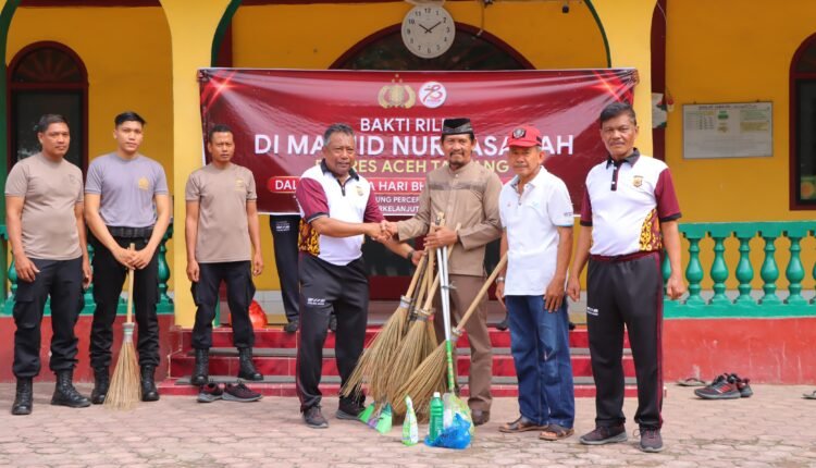 TODAYBERITA.COM | Aceh Tamiang – Polda Aceh, – Polres Aceh Tamiang mengelar Bakti Religi dengan melaksanakan gotong royong membersihkan rumah ibadah bertempat di Masjid Nur Hasanah Desa Kebun Tanah Terban Kecamatan Karang Baru Kabupaten Aceh Tamiang. (21/06/2024).
