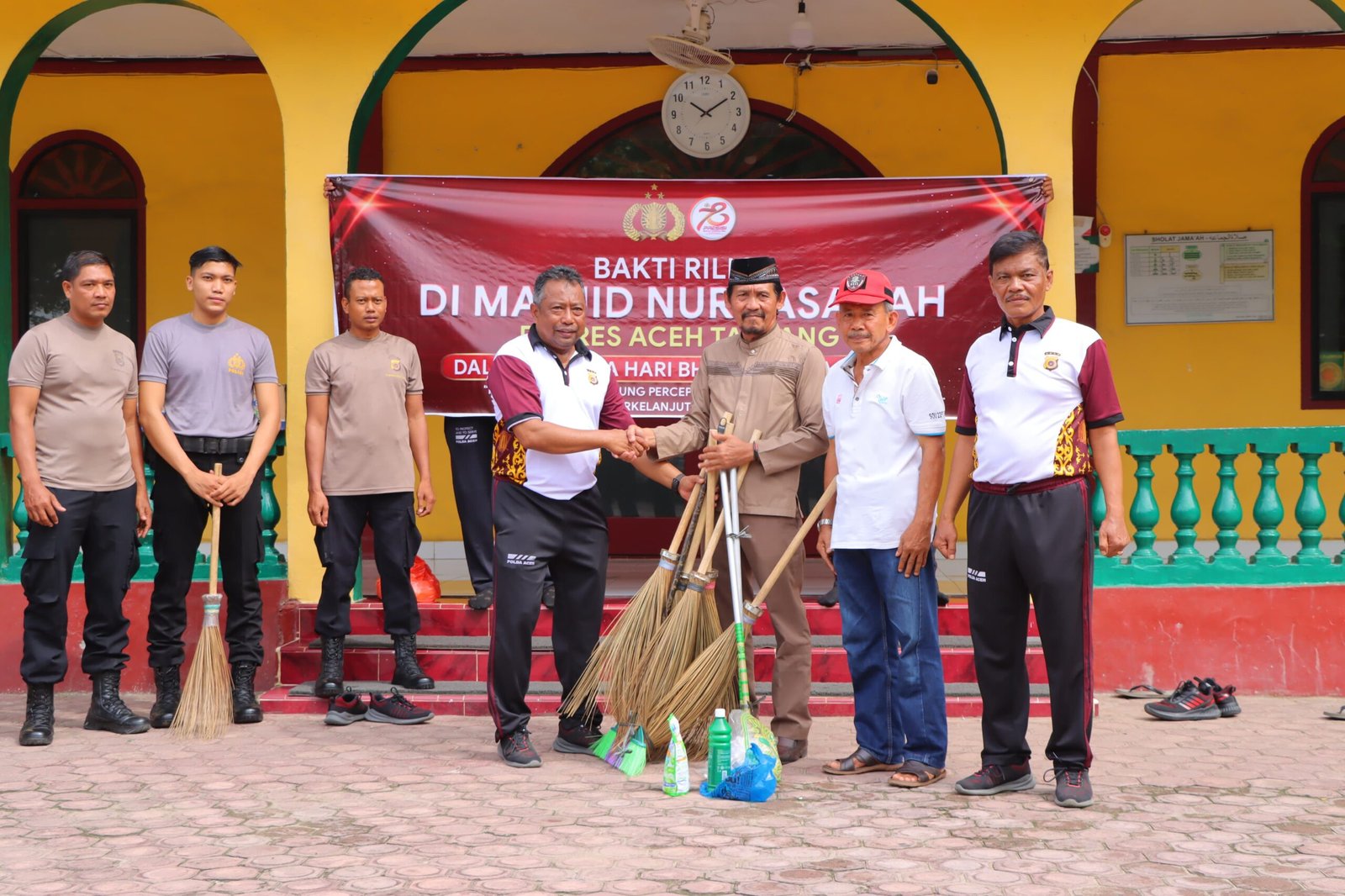 Dalam Rangka Hari Bhayangkara ke-78, Polres Aceh Tamiang Mengelar Bakti Religi Bersihkan Rumah Ibadah