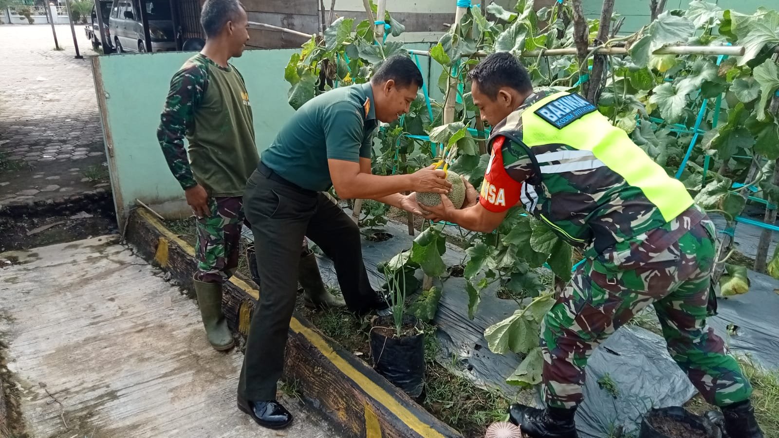 Kini setelah 2 bulan dilakukan perawatan secara intens, hari ini Kebun melon manfaatkan halaman kantor Koramil 02/Karang Baru sudah dilakukan pemanenan,” ujar Danramil Kapten Inf Sri Indarjo