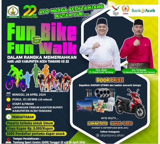 TODAYBERITA.COM | Aceh Tamiang – Dalam rangka memeriahkan Hari Jadi Kabupaten Aceh Tamiang ke-22, Dinas Pariwisata, Pemuda dan Olahraga akan menggelar kegiatan Fun Bike dan Fun Walk pada Minggu, 28 April 2024 di Lapangan Tribun Kantor Bupati Aceh Tamiang.