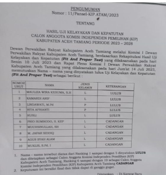 Atas nama Dewan Perwakilan Rakyat Kabupaten Aceh Tamiang dan ditandatangi oleh Ketua Komisi I, Miswanto, SH telah mengumumkan pengumuman nomor: 11/Pansel-KIP.ATAM/2023, tentang Hasil Uji Kelayakan dan Kepatutan Calon Anggota Komisi Indenpeden Pemilihan (KIP) Kabupaten Aceh Tamiang Periode 2022 – 2028.