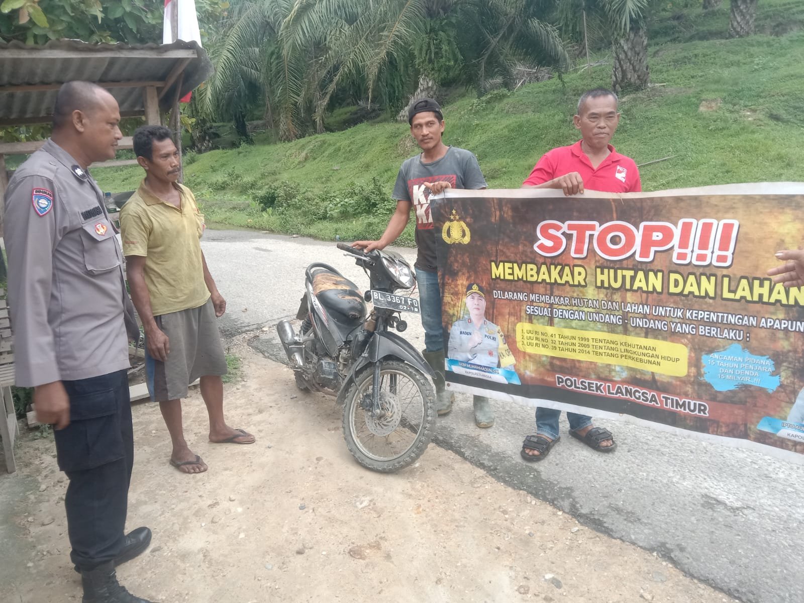 ” Dalam sosialisasi tersebut personel Polsek Langsa Timur membentangkan spanduk Larangan membakar Hutan dan lahan dan menghimbau kepada masyarakat tentang larang pembakaran hutan dan lahan sesuai undang-undang Nomor 41 tahun 1999 tentang kehutanan, undang-undang Nomor 32 tahun 2009 tentang Lingkungan hidup dan undang-undang Nomor 39 tahun 2014 tentang Perkebunan.” Kata Kapolsek Langsa Timur Iptu Aulia Budiman SH,MH