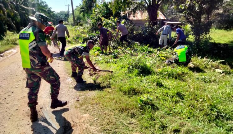 Jum’at Bersih, Anggota Koramil 07/Kejujuran Muda Bersama Warga Gotong Royong Bersihkan Parit Kiri Kanan Jalan