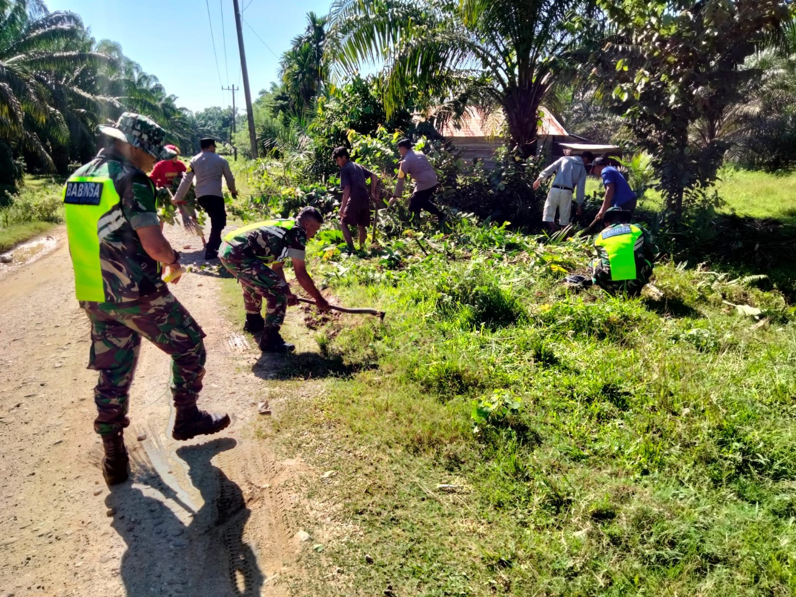Serka Edi Harianto selaku Babinsa Desa tersebut bersama Babinkamtibnas dan masyarakat Desa binaan melaksanakan aksi bersih atau gotong-royong untuk membersihkan parit dari rumput liar dan sampah.