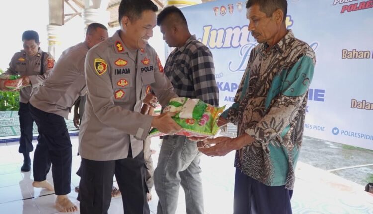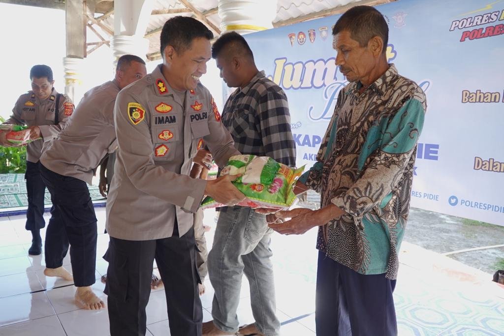 Dalam kesempatan tersebut Kapolres Pidie AKBP Imam Asfali, SIK bersama Wakapolres Kompol Misyanto, SE, M,Si juga menyerahkan sejumlah sembako kepada masyarakat kurang mampu di Gampong Baro Kecamatan Pidie.