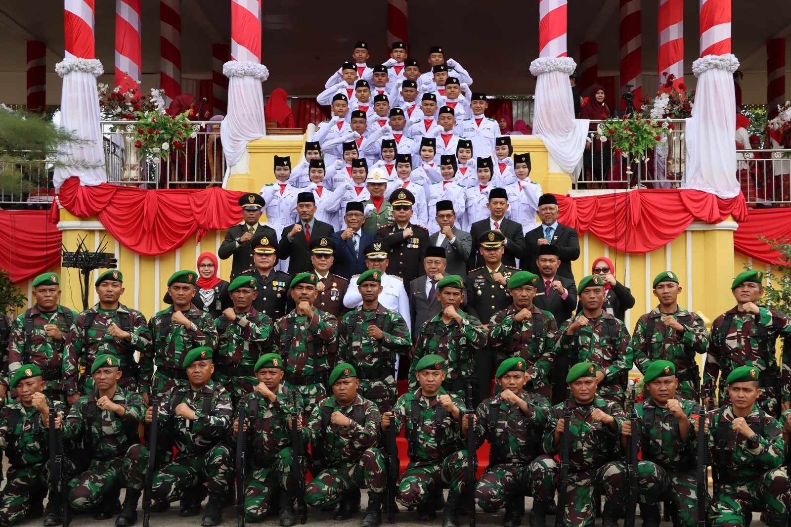 Setelah upacara selesai, Kapolres bersama seluruh Forkopimda berfoto bersama di depan tribun belakang Kantor Bupati Aceh Tamiang sebagai simbol kebersamaan dan sinergi dalam membangun Kabupaten Aceh Tamiang.