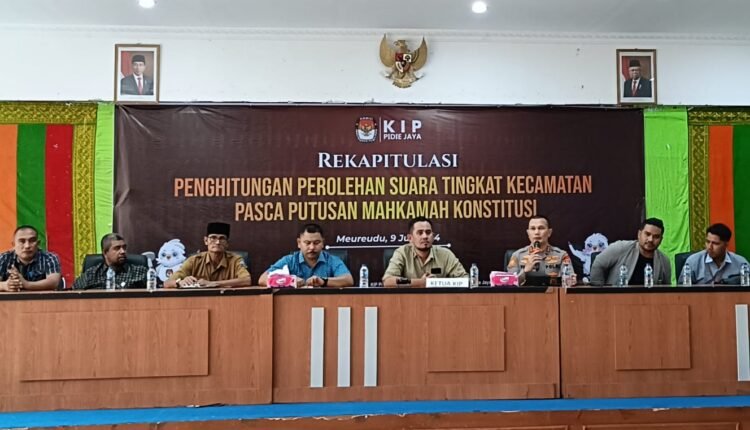“Rekapitulasi penghitungan perolehan suara tingkat kecamatan yang kita tampilkan hari ini adalah penghitungan ulang surat suara (PUSS) calon anggota DPRK Pidie Jaya. Kepada yang mendapat kursi di DPRK agar mensyukurinya, dan kepada yang belum mendapatkan agar evaluasi kembali. Semoga kegiatan ini berjalan lancar. Jika ada pihak saksi yang keberatan, agar mengajukan sesuai dengan aturan yang berlaku.” tambah Kapolres