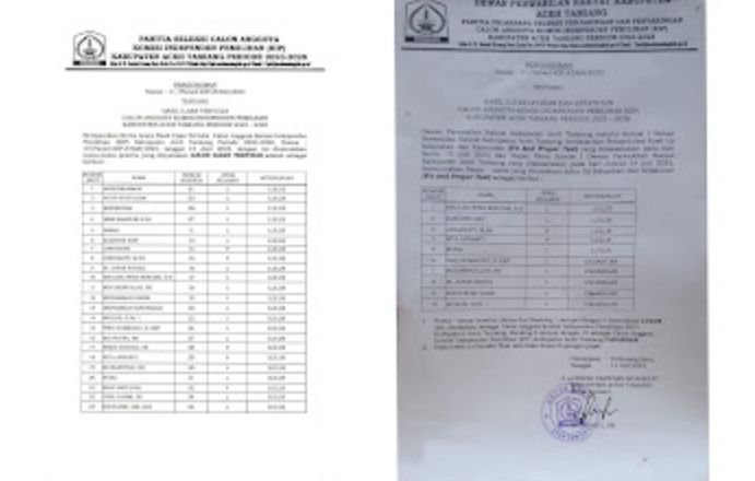 Minggu pagi (16/07/2023), surat pengumuman hasil uji kelayakan dan kepatutan calon anggota Komisi Independen Pemilihan (KIP) Kabupaten Aceh Tamiang periode 2023-2028 yang menggunakan kop surat dan stempel DPRK Aceh Tamiang tertanggal 14 Juli 2023 serta ditandatangani Ketua Komisi I, Miswanto, nomor suratnya tidak beda atau sama dengan nomor surat yang dikeluarkan oleh Panitia Seleksi calon anggota KIP yang ditandatangani Ketua Pansel, Ali Yandi, SH, tertanggal 13 Juli 2023, yakni bernomor: 11/Pansel-KIP.ATAM/2023.