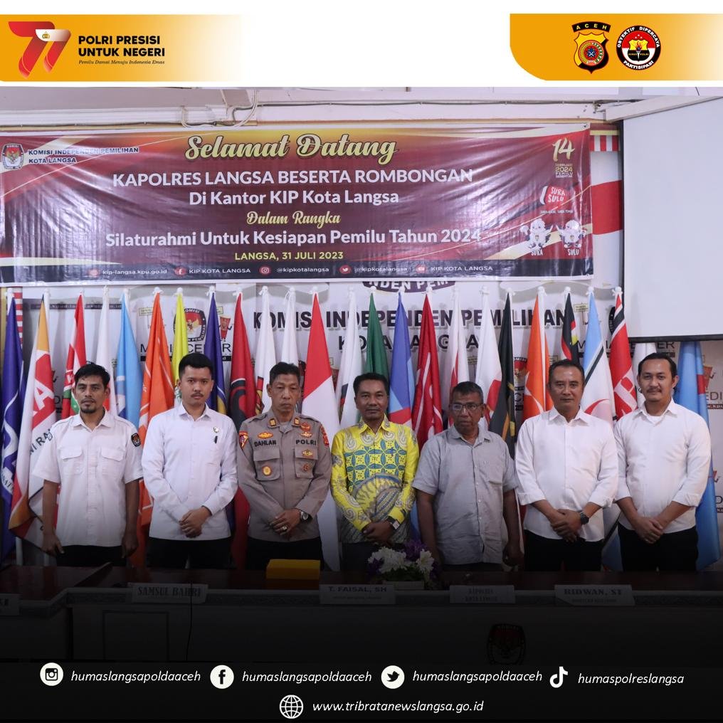 Pada hari Senin tanggal 31 Juli 2023 sekira pukul 10.00 WIB bertempat di Aula KIP Kota Langsa Gp. Birem Puntong Kec. Langsa Baro Kota Langsa telah dilaksanakan giat Kunjungan kerja Polres Langsa ke kantor Komisi Independen Pemilihan (KIP) Kota Langsa dalam rangka silaturahmi untuk kesiapan Pemilu Tahun 2024.