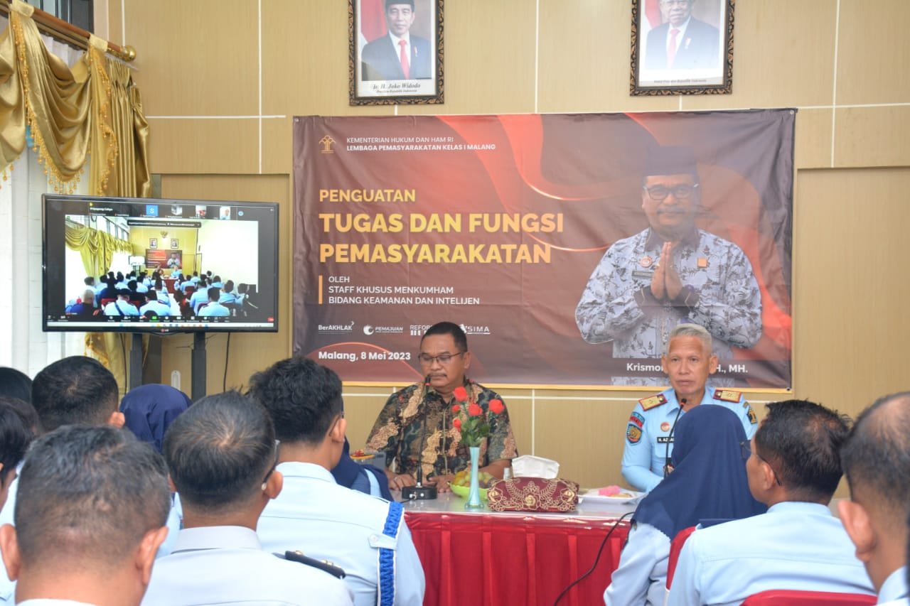 NEWS, LAPAS MALANG – Senin (8/5/2023) Lapas Kelas I Malang Kanwil Kemenkumham Jawa Timur mengadakan kegiatan Penguatan dan Fungsi Pemasyarakatan oleh Staf Khusus Menkumham RI Bidang Keamanan dan Intelijen, Krismono kepada Pejabat Struktural dan Pegawai UPT Pemasyarakatan Malang Raya.