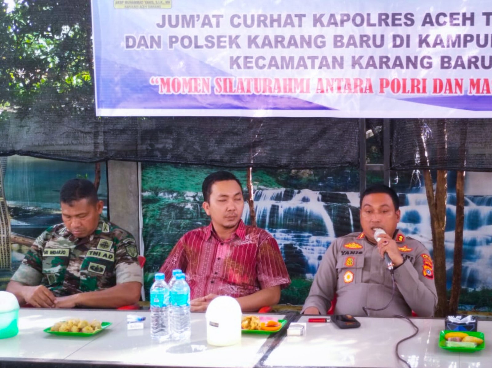 Dalam kegiatan tersebut terdapat beberapa penyampaian dari Kapolres Aceh Tamiang, yaitu kegiatan Jum’at Curhat ini dilakukan dengan cara tatap muka dan mendengarkan langsung keluhan mau pun saran dari masyarakat yang selanjutnya akan di tampung dan menjadi evaluasi untuk Polri khususnya di wilayah Kabupaten Aceh Tamiang”ucap Kapolres