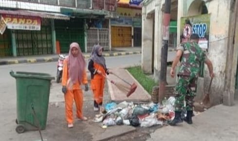 Dengan sigap, Serda Basyuni mengangkat karung sampah dan memegang sapu lidi, lalu membantu membersihkan sampah yang tidak enak dipandang yang sudah mengganggu pemandangan, kegiatan tersebut dilakukannya bersama-sama para petugas kebersihan.