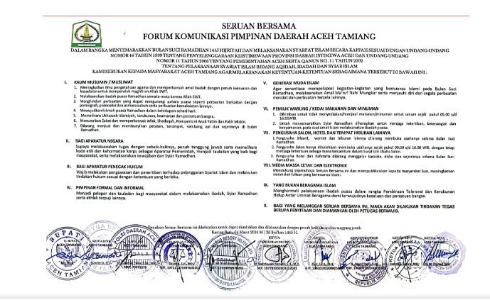 TODAYBERITA.COM | Aceh Tamiang – Pemerintah Kabupaten Aceh Tamiang bersama Forkopimda mengeluarkan seruan bersama dan imbauan terkait pelaksanaan ibadah selama bulan bulan suci Ramadhan 1445 Hijriah tahun 2024. Seruan bersama yang ditandatangani pada 04 Maret 2024 ini dibuat bertujuan untuk menjaga kekhusyukan dalam beribadah, dimana terdapat beberapa anjuran dan himbauan yang harus ditaati masyarakat, ASN, Aparatur Penegak Hukum, Pimpinan Formal dan Informal, Pemilik warung/kedai makanan dan minuman serta pengusaha selama pelaksanaan ibadah bulan ramadhan.