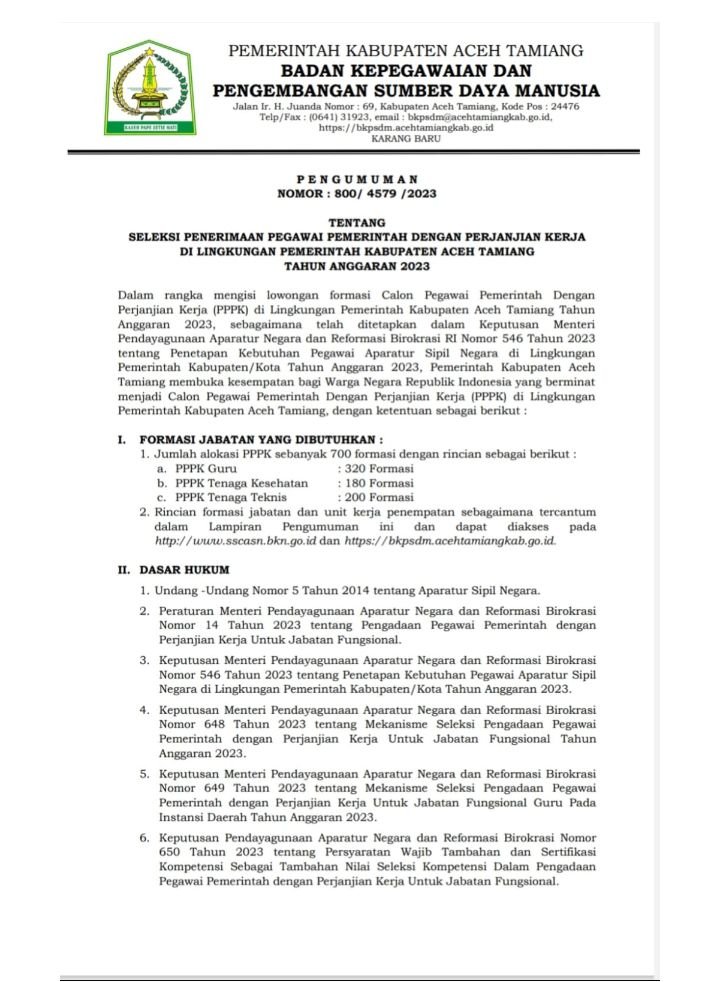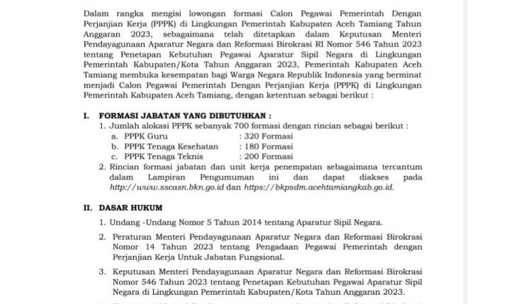 TODAYBERITA.COM| Aceh Tamiang – Pemerintah Kabupaten Aceh Tamiang melalui Badan Kepegawaian dan Pengembangan Sumber Daya Manusia membuka sebanyak 700 Formasi Calon Pegawai Pemerintah Dengan Perjanjian Kerja (PPPK) Tahun 2023. Pembukaan Formasi ini telah ditetapkan dalam Keputusan Menteri Pendayagunaan Aparatur Negara dan Reformasi Birokrasi RI Nomor 546 Tahun 2023 tentang Penetapan Kebutuhan Pegawai Aparatur Sipil Negara di Lingkungan Pemerintah Kabupaten/Kota.
