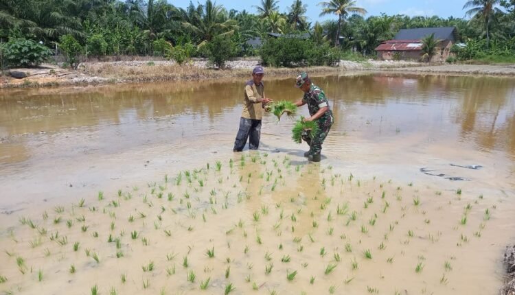 TODAYBERITA.COM | Aceh Tamiang-Untuk membantu meringankan pekerjaan Petani diwilayah Binaanya, Babinsa Koramil 03/Seruway jajaran Kodim 0117/Aceh Tamiang Sertu Ahmad Yahya mendampingi dan membantu Petani menanam padi di lahan milik bapak Rahman salah satu aAnggota Kelompok Tani Pelopor di Desa Tangsi Lama, Kecamatan Seruway, Kabupaten Aceh Tamiang. Kamis (27/07/2023).