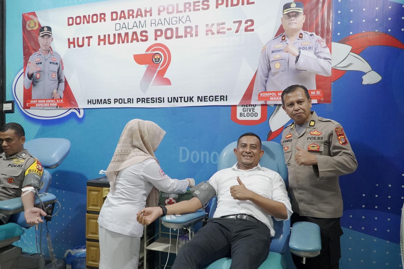 Kapolres Pidie AKBP Imam Asfali, SIK, melalui Kasi Humas AKP Anwar, S.Ag, mengatakan kegiatan donor darah ini dalam rangka memperingati Hari Humas Polri ke-72 yang dilaksanakan di Kantor PMI Kab. Pidie.