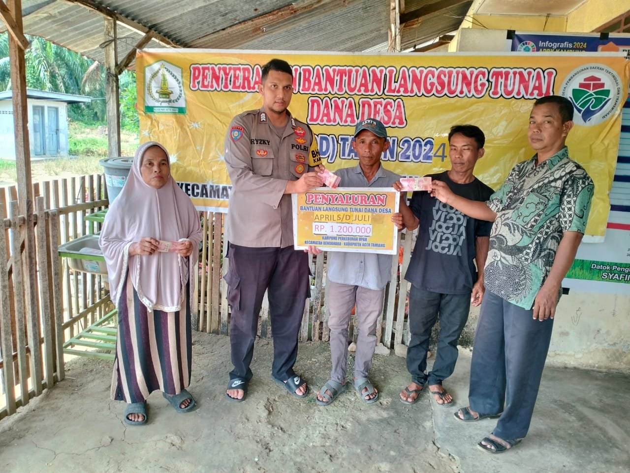 TODAYBERITA.COM | Aceh Tamiang – Polda Aceh, Personel Polsek Bendahara melaksanakan pengamanan dan Monitoring Penyaluran Bantuan Langsung Tunai (BLT) bersumber dari Dana Desa (DD) Tahun Anggaran 2024 di Kantor Datok Penghulu Desa Perkebunan Upah Kecamatan Bendahara Kabupaten Aceh Tamiang. Sabtu (27/07/2024).
