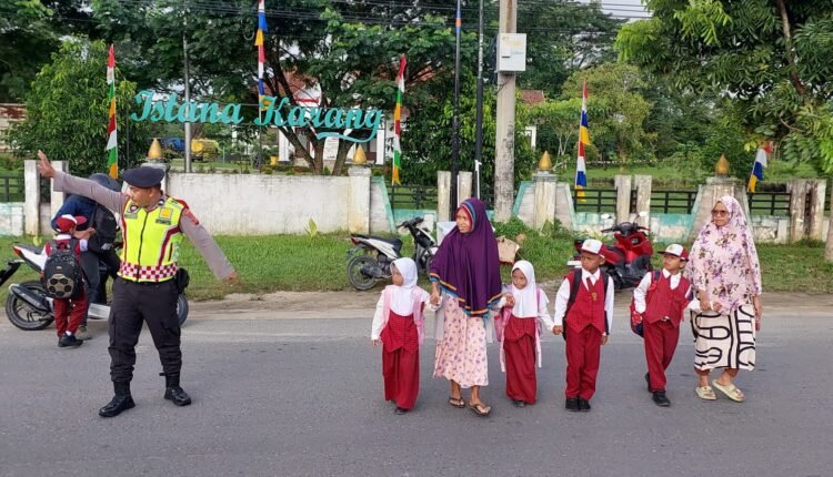 Personel Sat Samapta Polres Aceh Tamiang Laksanakan Giat Strong Point Pada Jam Masuk sekolah