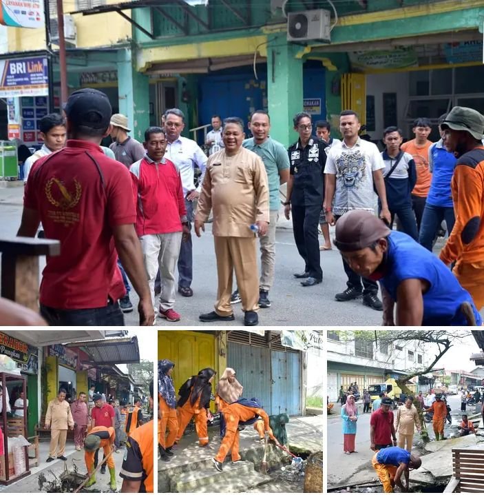 Jum’at, (5/1/24) Pj. Bupati Aceh Tamiang, Drs. Asra memimpin gotong royong pembersihan saluran parit di tengah Kota Kualasimpang Jln. KS Tubun.