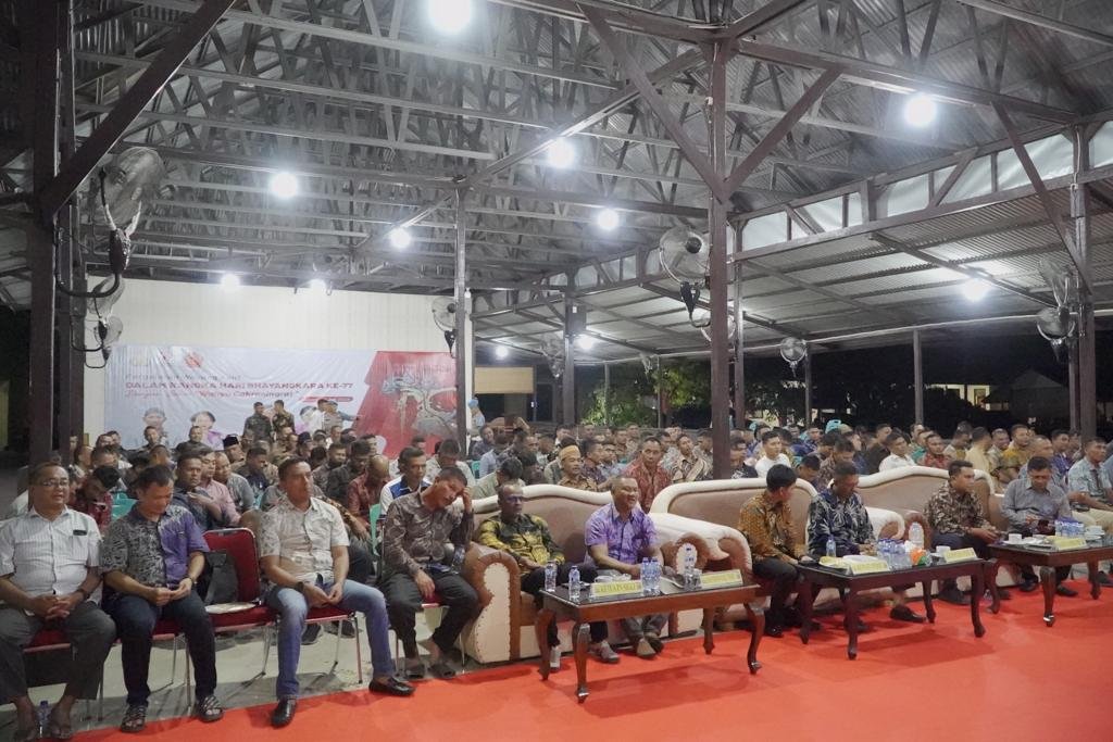 Terlihat sekitar 350 penonton yang terdiri Personil Polres Pidie dan Masyarakat ikut menyaksikan Pergelaran Wayang Kulit secara Live dan Streaming dalam rangka Hari Bhayangkara Ke-77 dengan Lakon “Wahyu Cakraningrat.” di Aula Dhira Brata Polres Pidie.**(R)