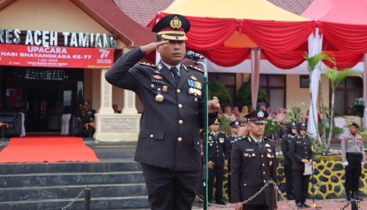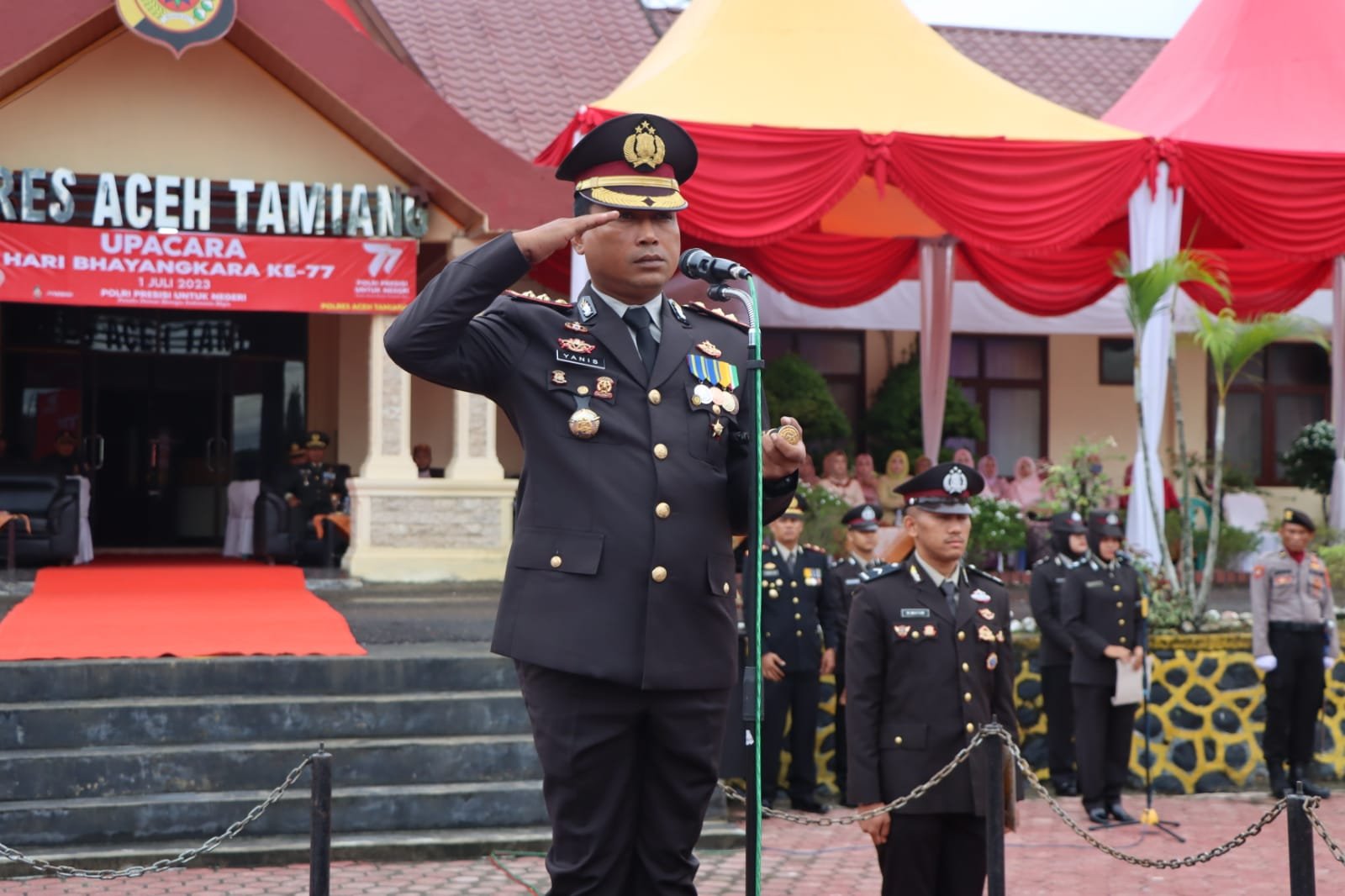 Kapolres Aceh Tamiang, AKBP Muhammad Yanis, SIK, MH, melalui Kasi Humas, AKP Untung Sumaryo mengatakan, telah dilaksanakan Upacara dalam rangka Hari Bhayangkara Ke-77 dengan tema “Polri Presisi Untuk Negeri”, “Pemilu Damai Menuju Indonesia Maju”.