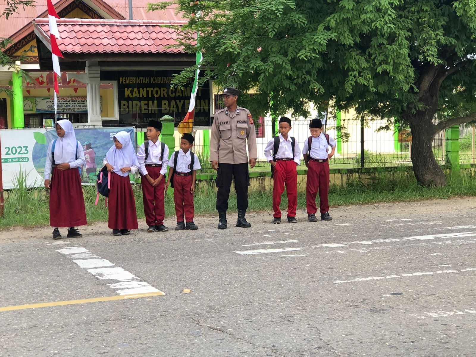 Polsek Birem Bayeun Rutin laksanakan Strong Point Rutin Bantu Anak Sekolah Menyeberang Jalan .