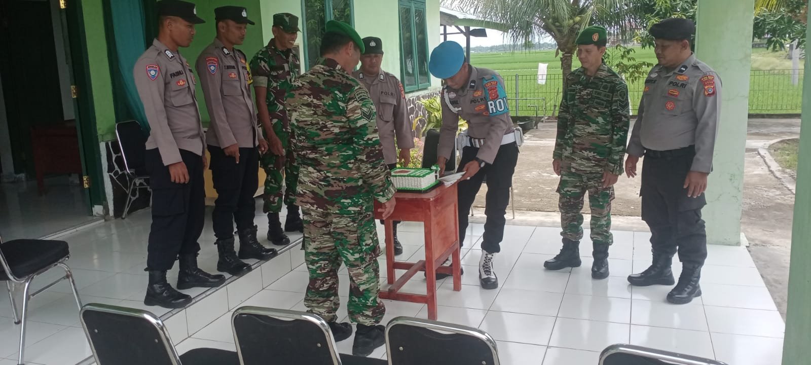 Penerimaan hangat dan gembira diberikan oleh anggota TNI di Koramil kepada para tamu yang hadir.