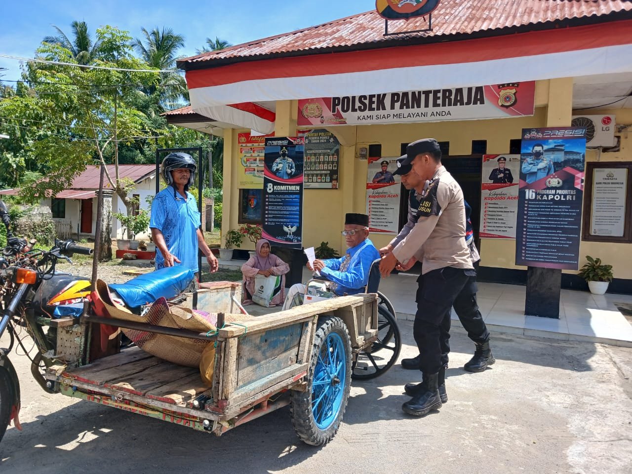 Mengetahui kesulitan yang dialami Bapak Ismail dalam berjalan, personel Polsek Panteraja dengan sigap dan penuh keikhlasan segera memberikan bantuan.