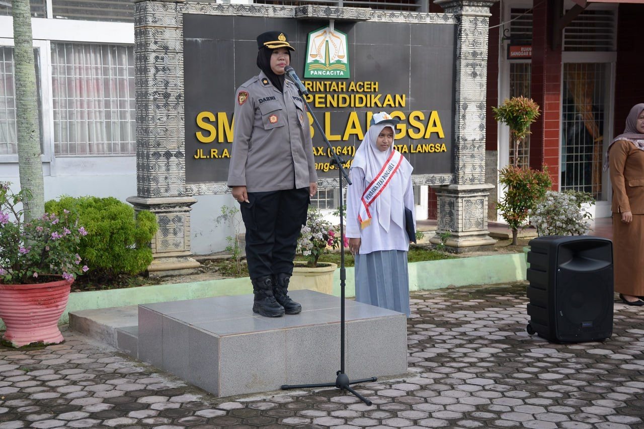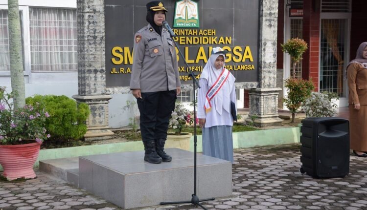 TODAYBERITA.COM | Langsa – Pelaksanaan upacara bendera dan menjadi Pembina upacara dilanjutkan dengan kegiatan sosialisasi dengan tema cerdas dan aman dalam bermedsos oleh polwan Polres Langsa, bertempat di Aula SMKN 3 Langsa.
