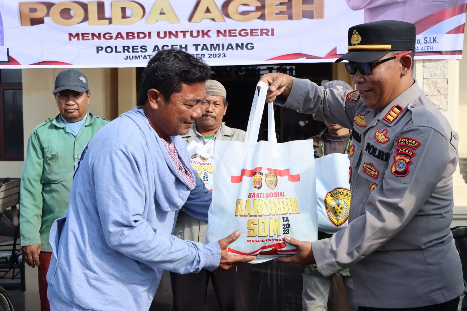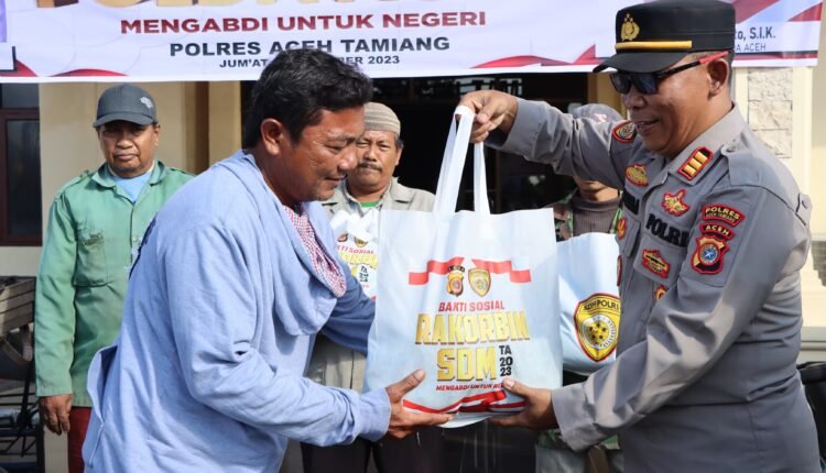 TODAYBERITA.COM| Aceh Tamiang – Dalam rangka Rakorbin SDM Polri TA 2023, Polres Aceh Tamiang membagikan 100 paket bantuan sosial (Bansos) untuk masyarakat yang membutuhkan di Lapangan Parama Satwika Mapolres Aceh Tamiang, Sabtu (04/11/23).