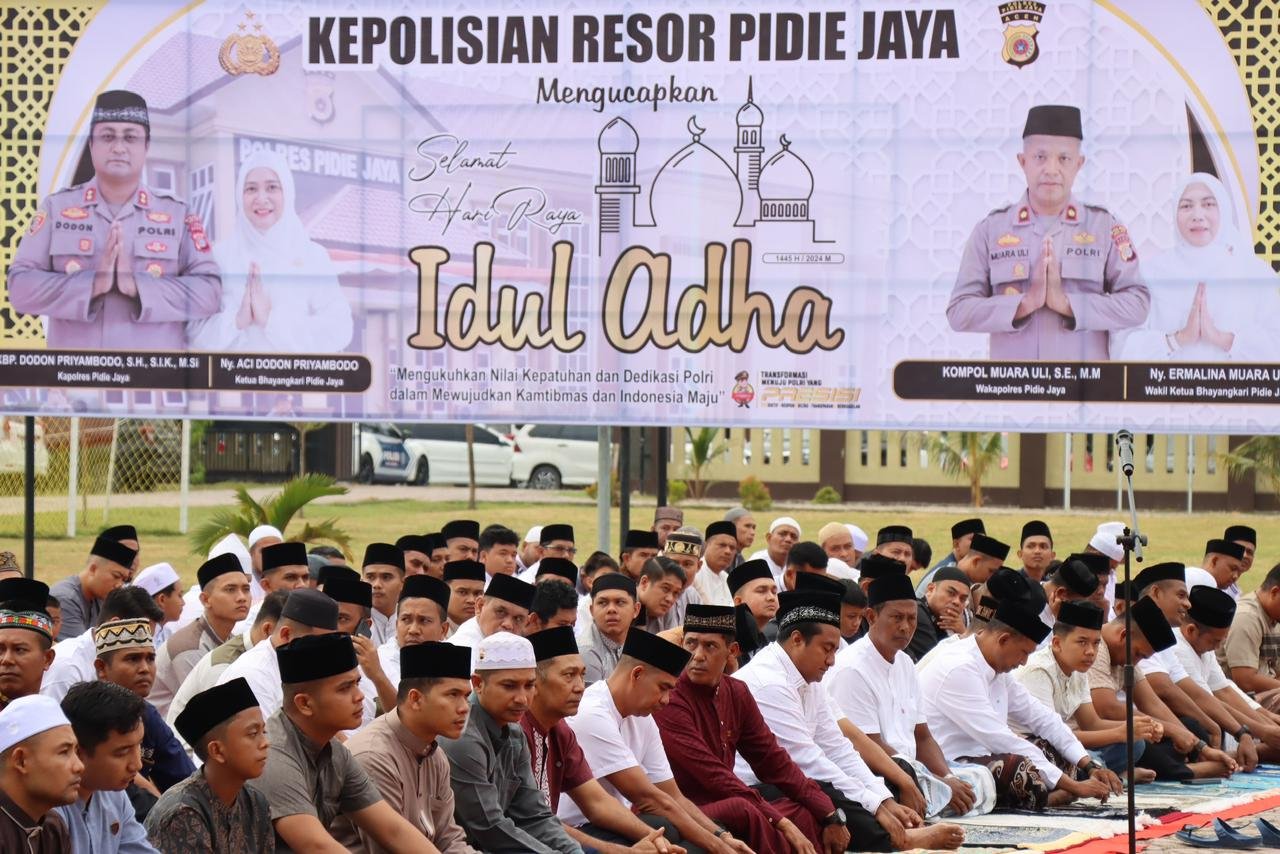 Kapolres Pidie Jaya, AKBP Dodon Priyambodo, menyatakan, “Kami Keluarga Besar Polres Pidie Jaya melaksanakan Shalat Hari Raya Idul Adha di Lapangan apel Mapolres dengan tema ‘Idul Adha Meneguhkan Nilai Kepatuhan dan Semangat Pengabdian Polri guna Mewujudkan Kamtibmas menuju Indonesia Maju’.”