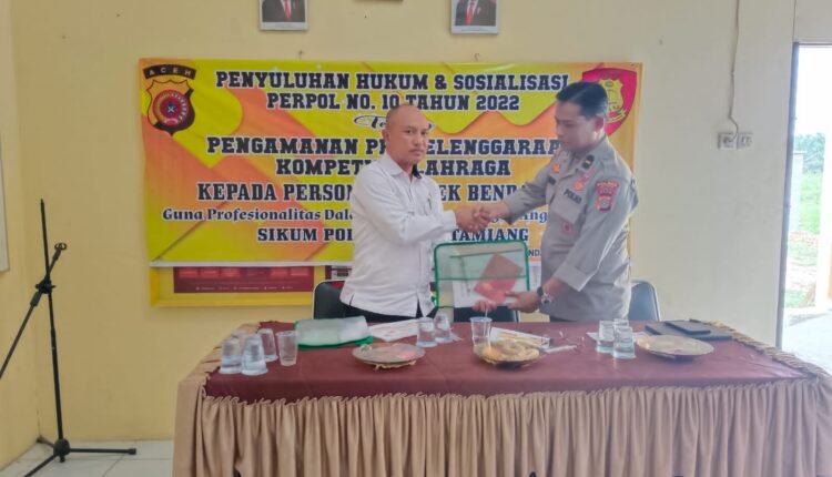 TODAYBERITA.COM – Aceh Tamiang | Polda Aceh, Sikum Polres Aceh Tamiang mengelar Penyuluhan hukum dan Sosialisasi peraturan Kepolisian Nomor 10 tahun 2022 tentang Pengamanan Penyelenggara Kompetisi Olahraha Kepada Anggota Polri bertempat di Mapolsek Bendahara. Selasa 07/05/24.