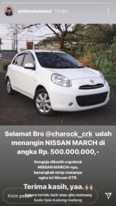 Hal ini pun sontak mengundang keramaian dijagat sosial media pada malam takbiran, dari artis hingga pengusaha teman terdekat Arief mencoba menawar mobil tersebut. Ada @Juragan_99, @indrakenz,@rizkymun, @julioioio, @gregoriusruben, @donisalmanan, @putrasiregarr17, @reyhanrizky13, dan terakhir @charock_crk.