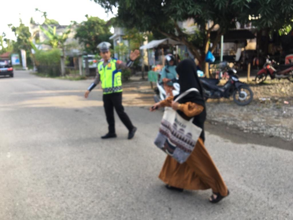Dengan fokus pada keamanan para pelajar, petugas polisi mengamankan dan mengatur arus lalu lintas saat anak-anak sekolah memulai aktivitas pagi.