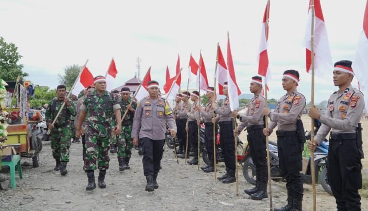 TNI/polri bersama masyarakat pesisir dan nelayan kibar kan bendera merah putih
