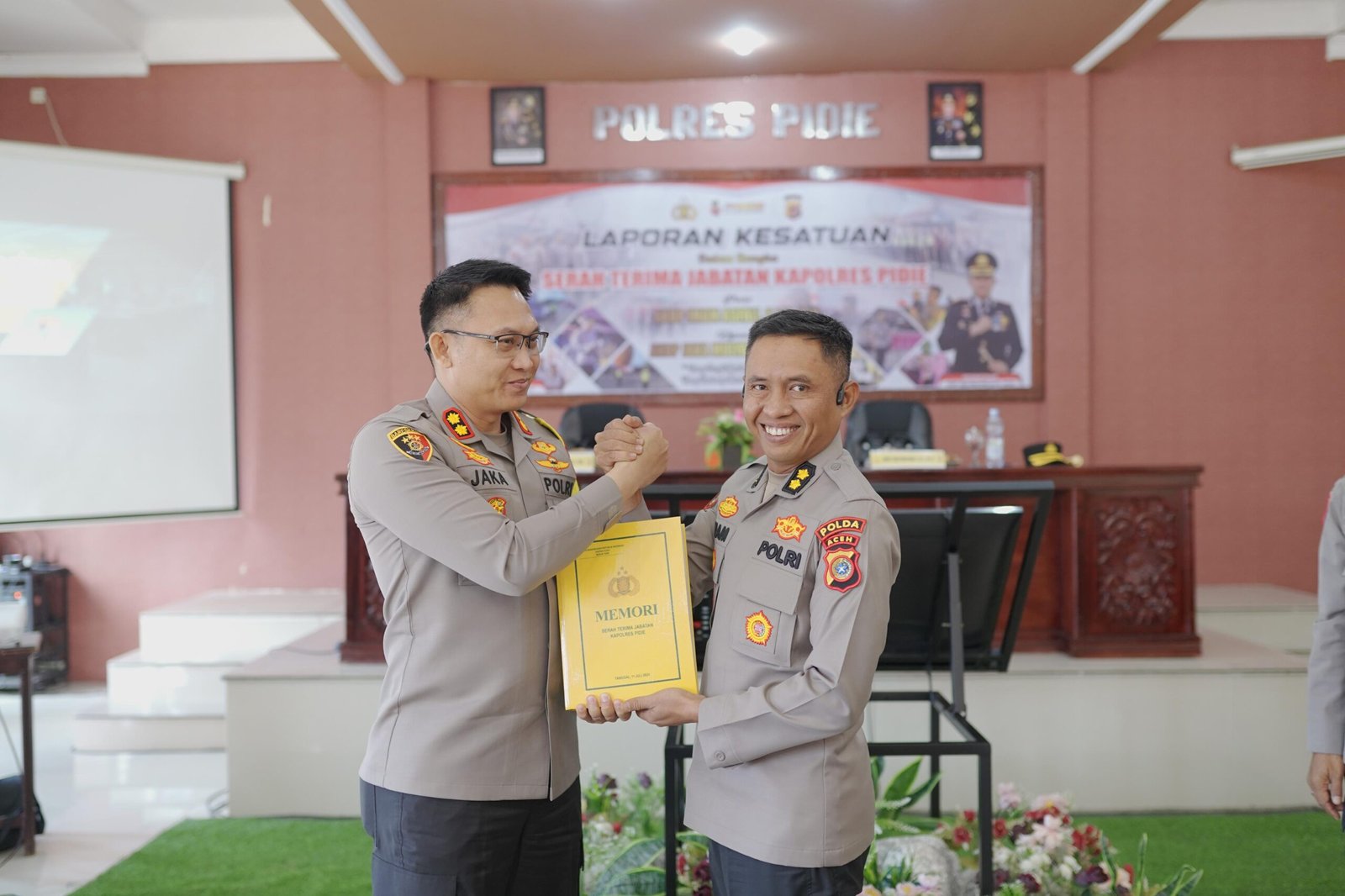 Selamat datang kepada AKBP Jaka Mulyana, S.I.K,. M.I.K di Polres Pidie. Semoga ini menjadi langkah awal yang baik dan dapat membawa Polres Pidie lebih baik lagi” ucap AKBP Imam Asfali, SIK, MH.